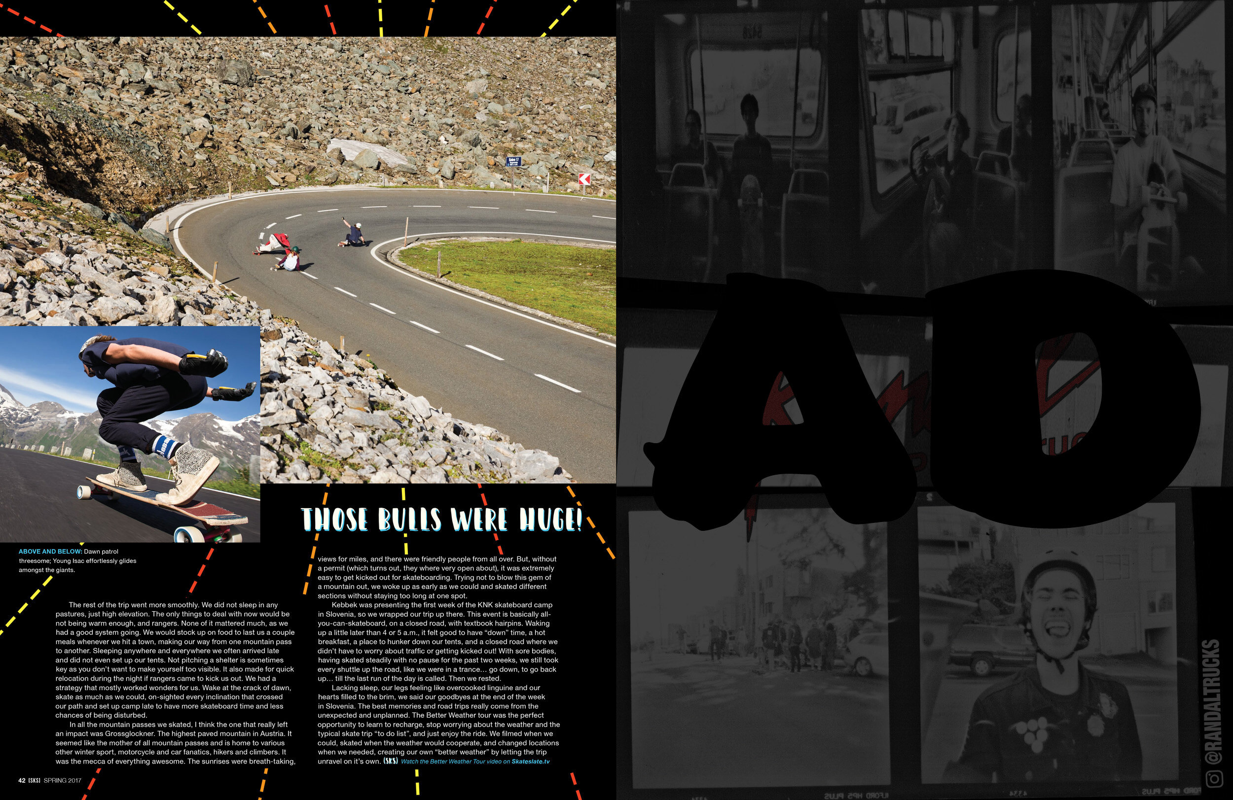 Page layout and typography for an article in Skate[Slate] Longboarding Magazine on a Kebbek Skateboards road trip in Switzerland.